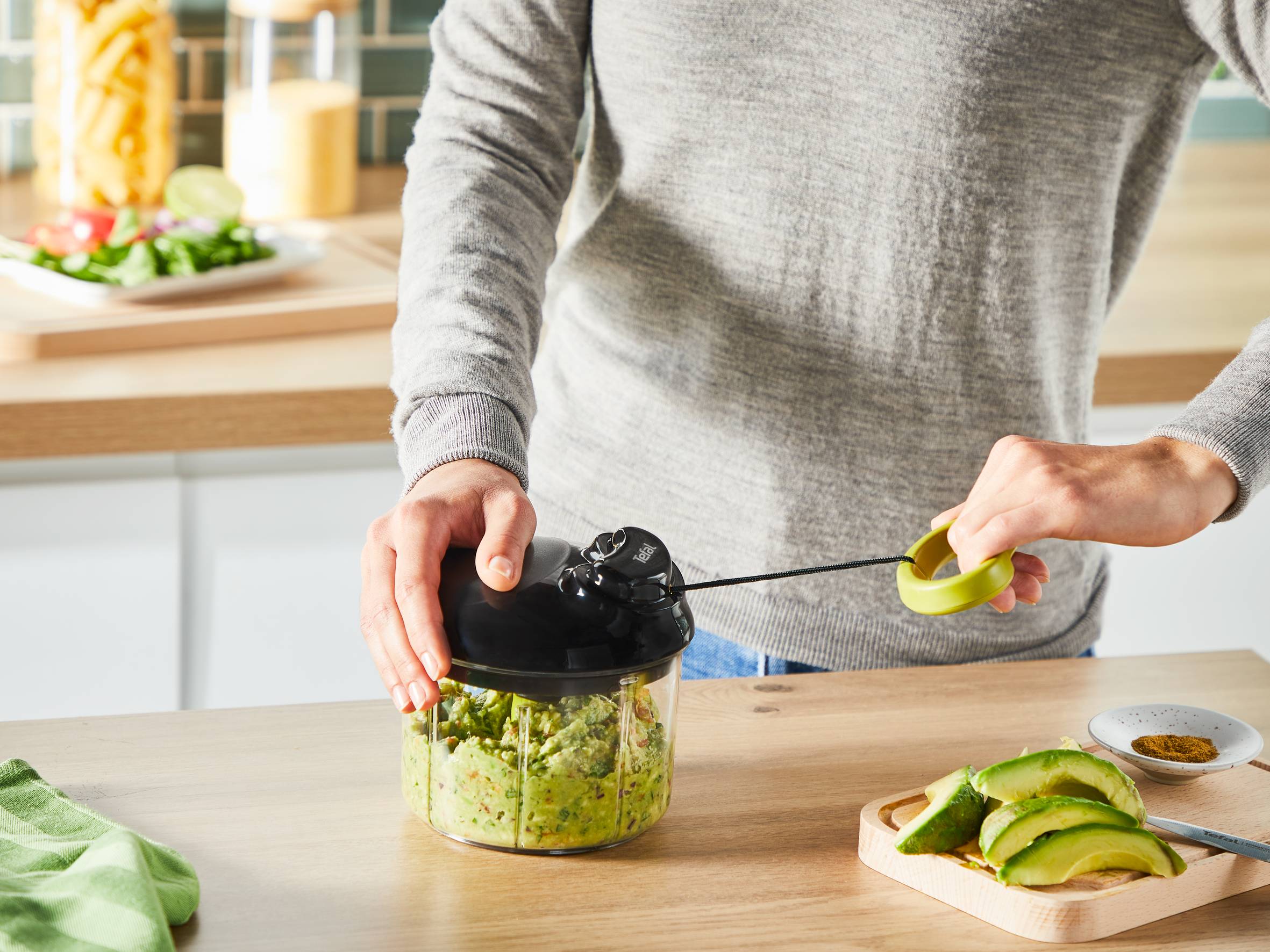 Csak szerelje fel a pengéket, rakja be a hozzávalókat, zárja le a fedelet, és húzza meg a fogantyút. Minél többször húzza, annál finomabb lesz az eredmény! Ez az elektromos áramot nem igénylő kézi aprító rendkívül ellenálló, független rozsdamentes acélkésekkel van felszerelve, amelyek bármilyen élelmiszerrel megbirkóznak – még az olyan kemény hozzávalókkal is, mint a diófélék és a hagyma –, hogy minden évszakban friss ételeket készíthessen, a nyugodt munkát pedig egy biztonságos zárrendszer garantálja. Ugyanakkor a BPA-mentes és kristálytiszta tál – bőséges 900 ml űrtartalommal – lehetővé teszi a vágási folyamat követését, a csúszásmentes talp pedig teljes kényelmet és stabilitást biztosít.