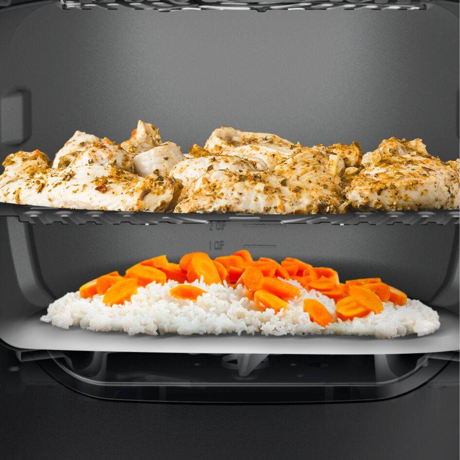 10 sokoldalú program: rizs/gabona, teljes ételek, párolt ételek, gőzölés, lassú főzés, vízben főzés, hús sütése, péksütemény, joghurt és melegítés Multifunkciós edény, amely megfőzi az ételt és melegen is tartja A kétszintes tartozéknak köszönhetően egyszerre többféle étel is elkészíthető, mivel a különböző összetevőket egyszerre készíti el A 6 l literes edény ideális akár hat adaghoz is, és tökéletes kapacitást kínál bármilyen alkalomra A fazék oldalsó fogantyúi lehetővé teszik a könnyű használatot, anélkül, hogy megégetné az ujjait Teljes értékű idő- és hőmérséklet-beállítás az igényeinek megfelelően, a tökéletes fogásokért 15 év szervizgarancia megfizethető áron: Javasoljuk, hogy szükség esetén az eszközét világszerte elérhető, 6200 szervizközpontunk egyikében javíttassa