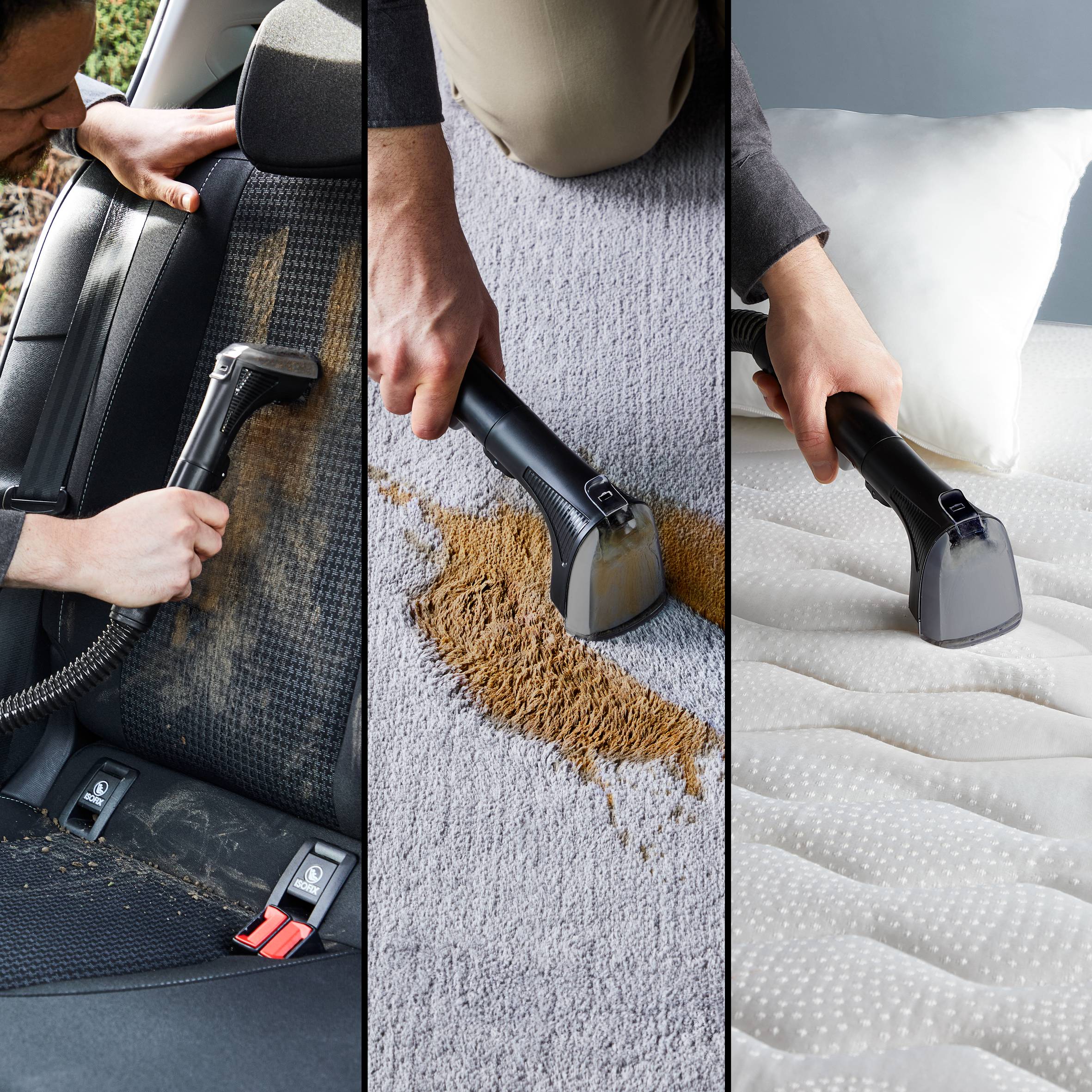 Folteltávolító, amely gyorsan és hatékonyan távolítja el a háziállatok által okozott foltokat, a kiömlött folyadékokat és egyéb szennyeződéseket a szőnyegekről és kárpitokról. Multifunkcionális tisztító hatás, amely egyesíti a víz, a tisztítószer, a kefe és az erőteljes porszívózás (akár 12,5 kPa, 400 W) hatását. Cserélhető tisztítófejek szőnyegek, kanapék, autók belső terei, kárpitok, matracok és egyéb felületek tisztításához Tisztítóspray a mindennapi szennyeződések és foltok egyszerű tisztításához, amely kellemes illatot biztosít Hosszú üzemidő: Könnyen feltölthető, nagyméretű, kivehető 1,8 literes víztartály a tiszta víz és 1,5 literes a piszkos víz tárolására, amely a megkönnyíti a kiürítését és a tisztítását Könnyű tárolás és használat, 5 m-es tápkábel és 1,75 m-es tömlő a széles hatósugárhoz Mindennapos praktikus használatra készült takarítóeszköz a hatékony takarítást és a könnyű használatot biztosító tartozékokkal. 15 éves javítási garanciánkkal támogatott minőség a környezetvédelem és a hulladékcsökkentés érdekében