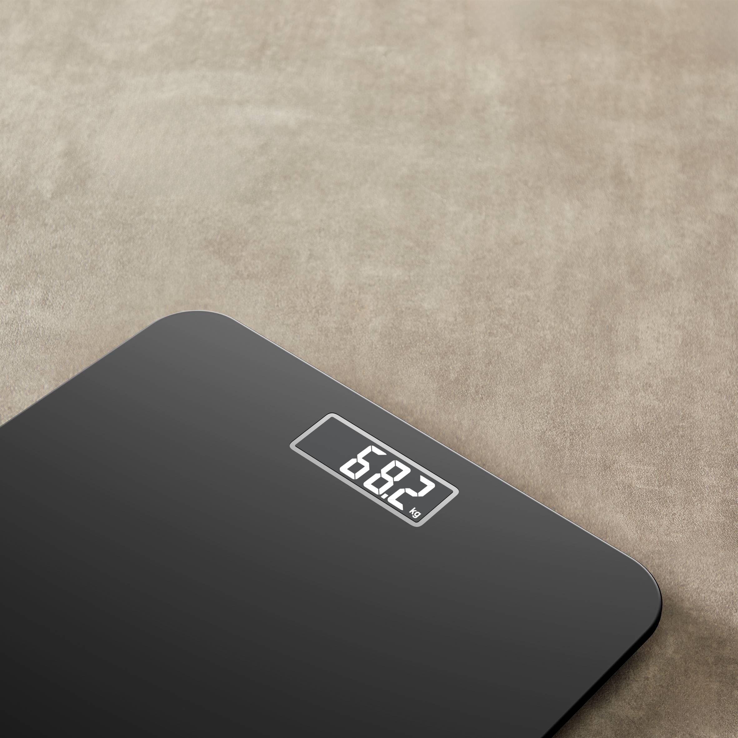 Könnyen leolvasható LCD-kijelző a mindig kényelmes használathoz Személymérleg 160 kg terhelhetőséggel és 100 g-os pontossággal Vékony kialakítású üveg mérlegfelület (30 x 30 cm) és mindössze 2,2 cm vastagság – ideális a diszkrét tároláshoz, amikor éppen nem használja.