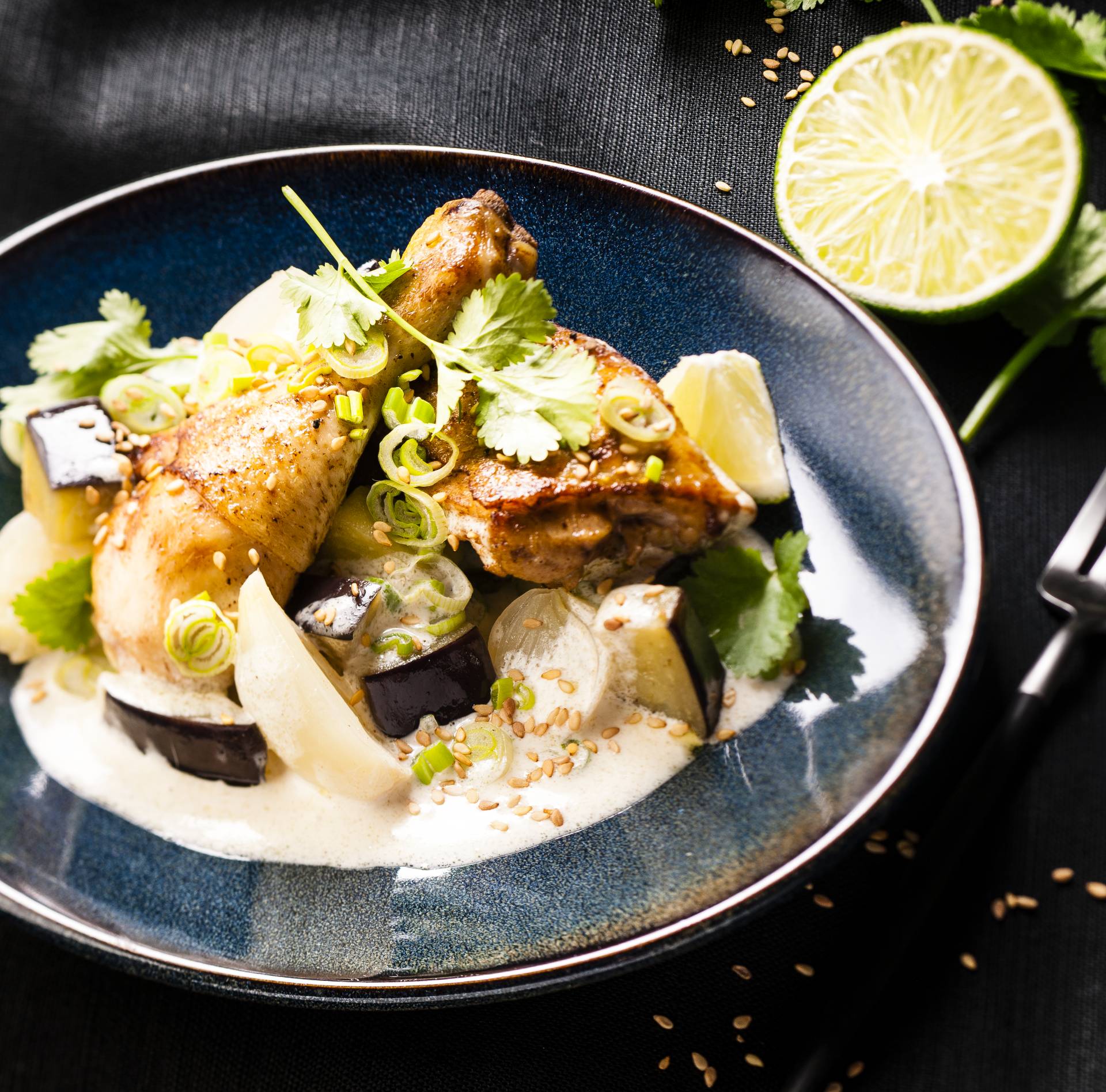 Tegye vissza a hagymát az edénybe. Adja hozzá a páclevet, a kókusztejet és a padlizsánt.