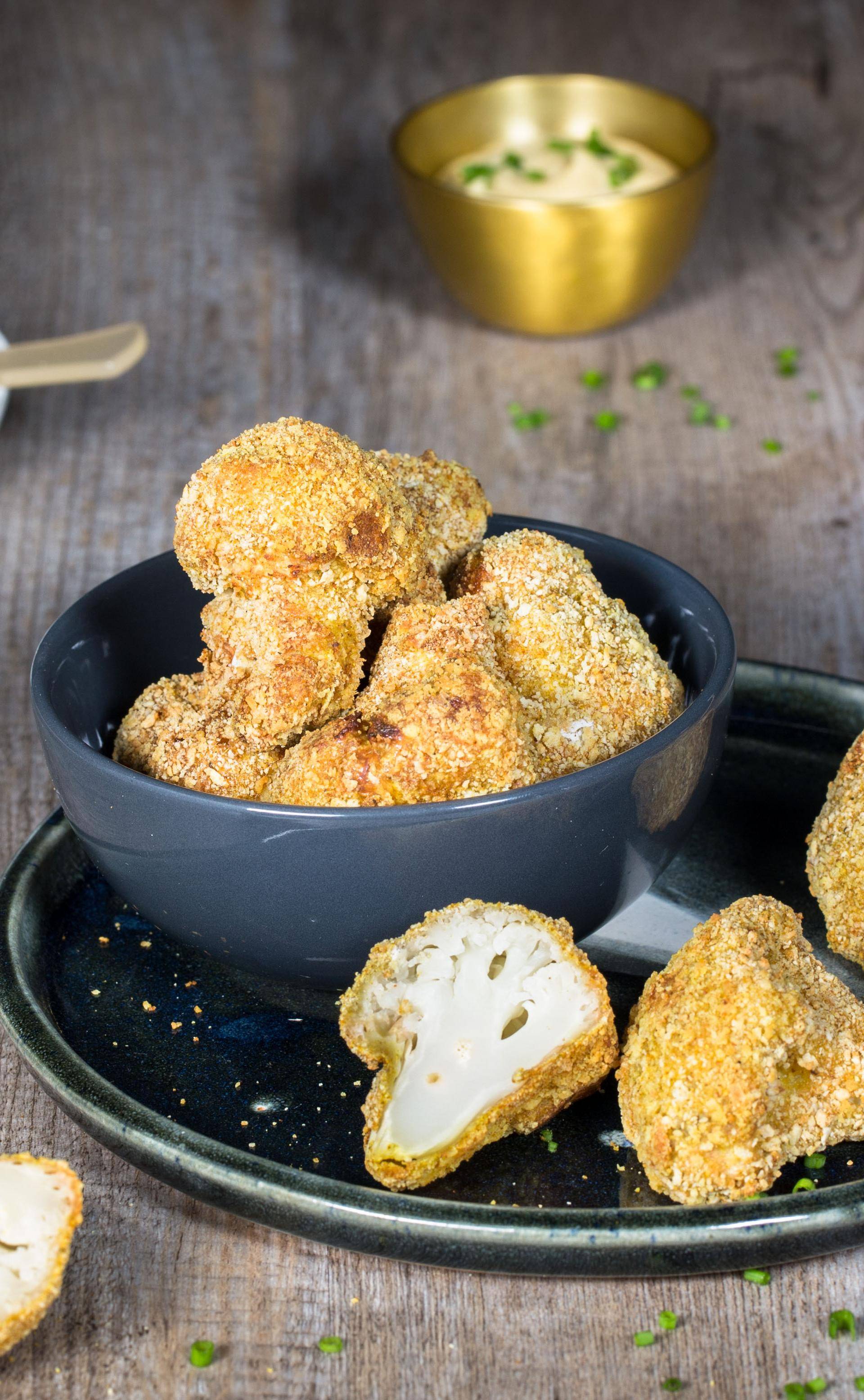 Mártsa a karfiolt a különböző tálkákba a következő sorrendben: tojás, majd liszt, majd ismét tojás, végül zsemlemorzsa. Minden tál előtt rázza le a karfiolról a felesleget, hogy elkerülje a csöpögést.