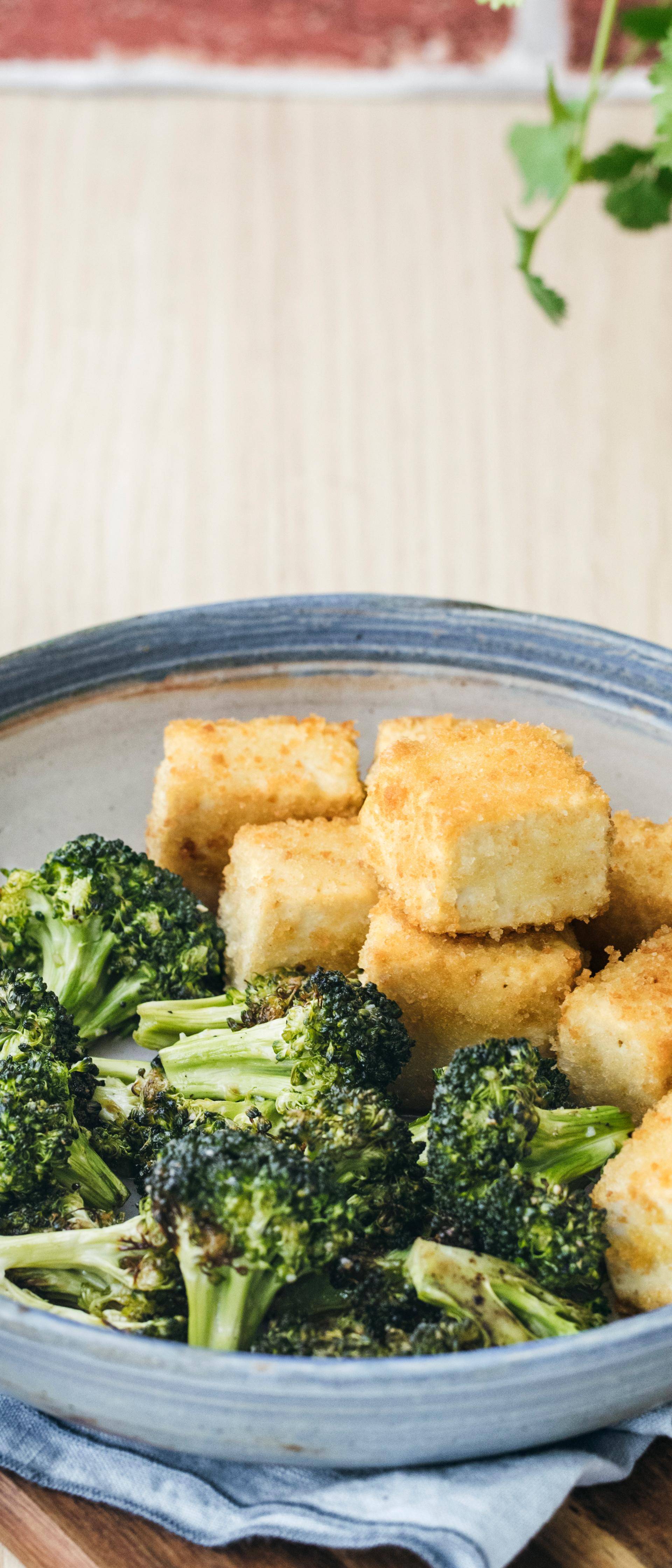 Helyezze be a grilltányért és az elválasztót a készülékbe. Kattintson a Szinkronizálás gombra, és válassza a NUGGETS üzemmódot a P1 programhoz. P2 esetében válassza a VEGETABLES üzemmódot. Először adja hozzá a tofut, és kenje meg olívaolajjal. Amikor megszólal az időzítő, adja hozzá a brokkolit, és folytassa a sütést. Főzés közben többször keverje meg.