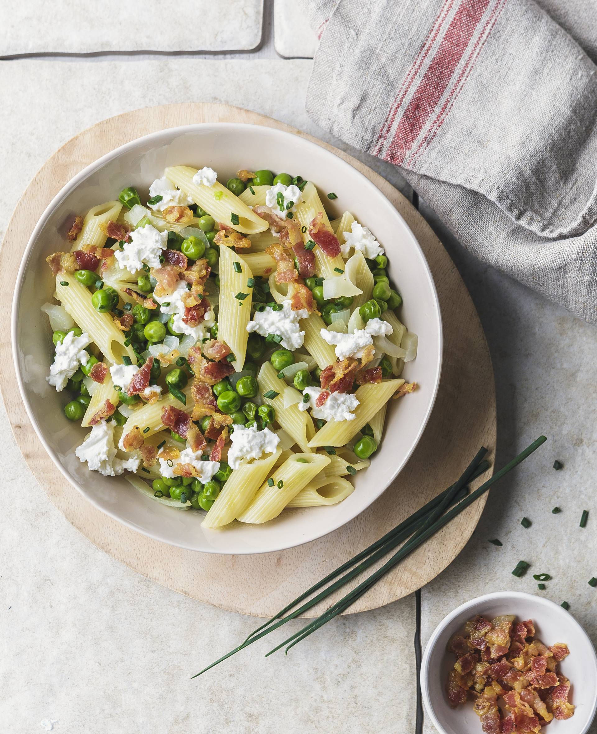 Keverjük össze, és tálaljuk morzsolt kecskesajttal, pancettával és apróra vágott metélőhagymával.